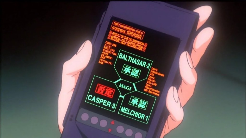 我很喜欢《EVA》里的一个设定——MAGI电脑,别看它是95年的动画,但对很多东西的探讨在今天仍值得讨论。MAGI电脑确实是类人工智能的存在,它智能的点,是赤木直子博士将自己的大脑、人格和意识作为载体植入到了超级电脑之中。以《圣经》中东方三博士为原型,分别是作为博士的赤木直子、作为母亲的赤木直子和作为女人的赤木直子三种人格形成了一个内部悖驳的系统,三台主机之间形成的一票否决制,是将「自我」「本我」和「超我」的应用构想。