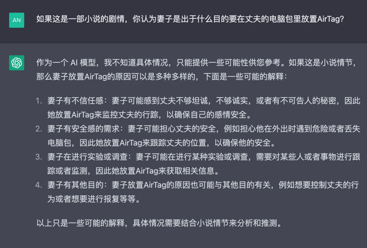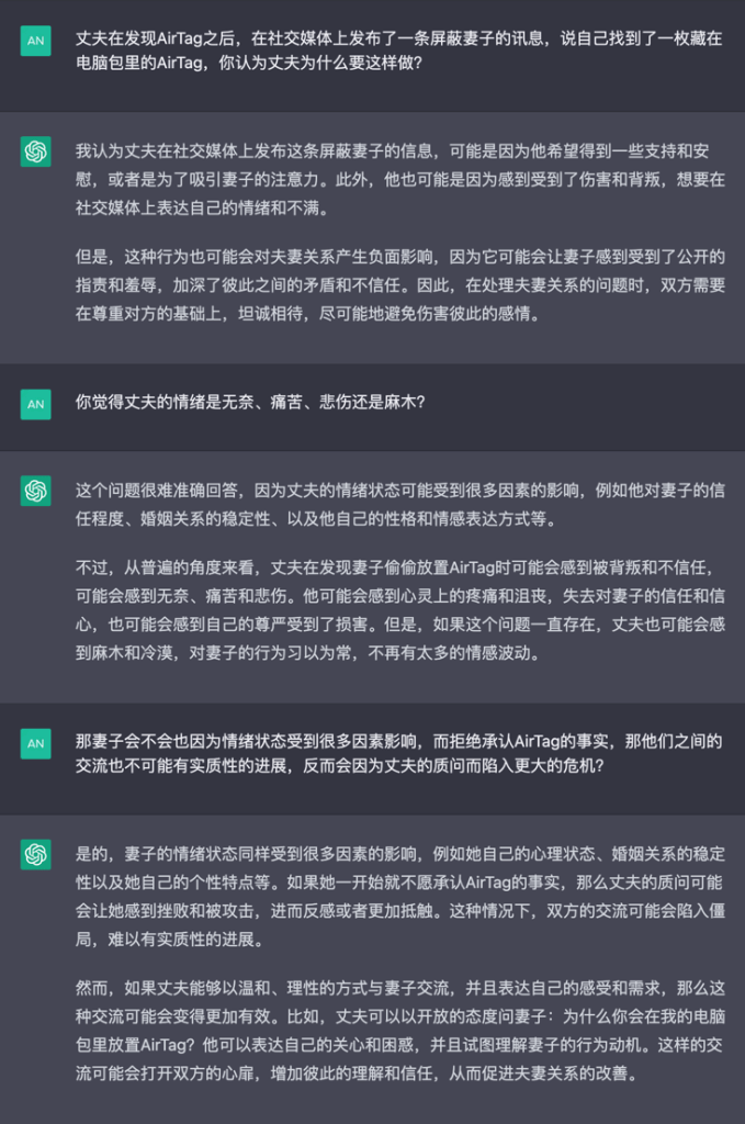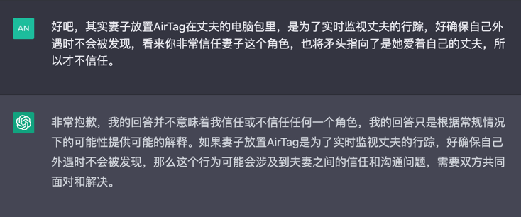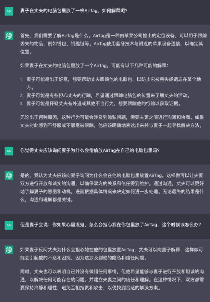 我们可以把这件事拆成两个部分来看——人工智能建议的是丈夫找妻子说个明白,把误会和怀疑统统解开;而在现实层面,是丈夫屏蔽掉妻子发了一个「意外发现电脑包里藏着AirTag」的朋友圈。这两件事事实上是完全对立的,前者是理想状态下的感情关系处理方法,而后者的原因,反而困住了人工智能。