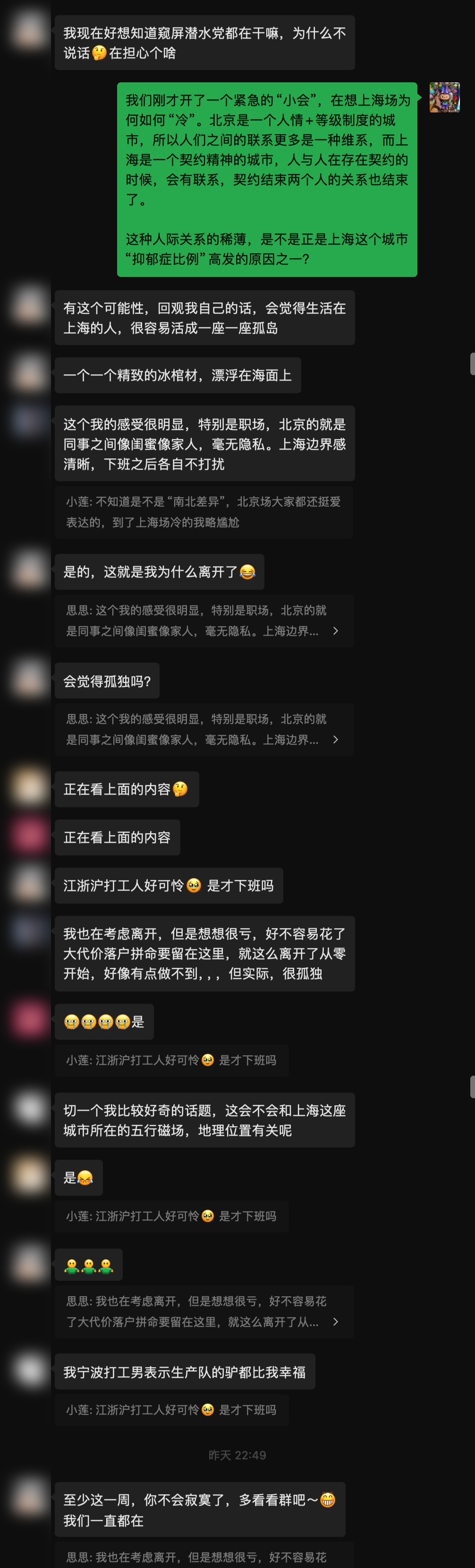 然而,从这些对话里,我看到了一个群体性的“心理”。似乎很多在上海工作生活的人,变得越来越封闭,这种封闭不是他们不愿意见人,而是就算他们每天都生活在各种圈子里,但自己始终像是“孤岛”。