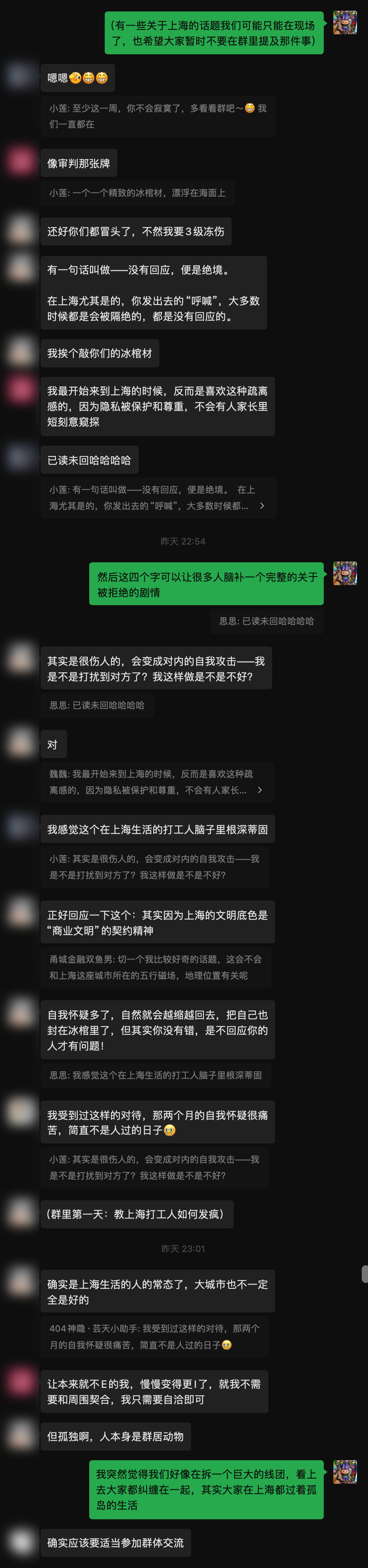 很有趣,北京场的TA竟然说,参与者都非常热情。北京场结束后,上海场为期一周的线上活动紧接着开始,但场子非常非常冰冷。从建群、到公布活动规则、到引出话题,完全没人参与其中。