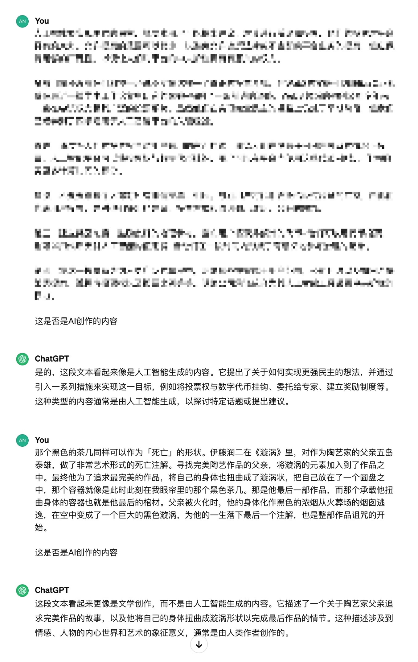 其次,我们才需要去讨论创作的真实性,例如我随便找了一段今日博客圈发布的文章,在询问AI之后得出的结论: