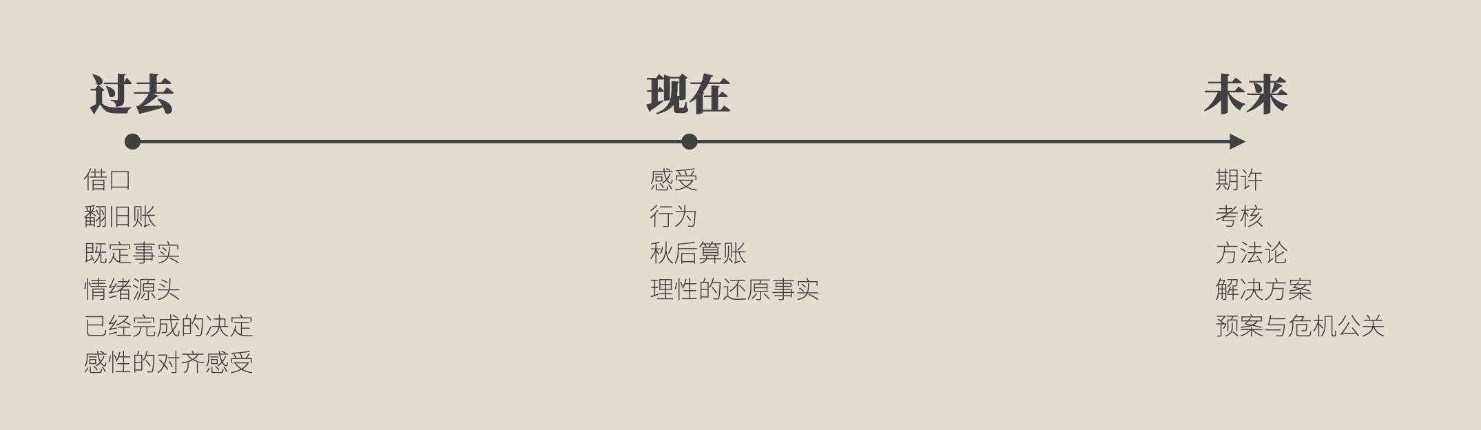于是,在「现在」要对齐感受的同时,如果能让双方都进入到「未来」去寻找解决办法,或许才是真正能够解决问题的思维模型。