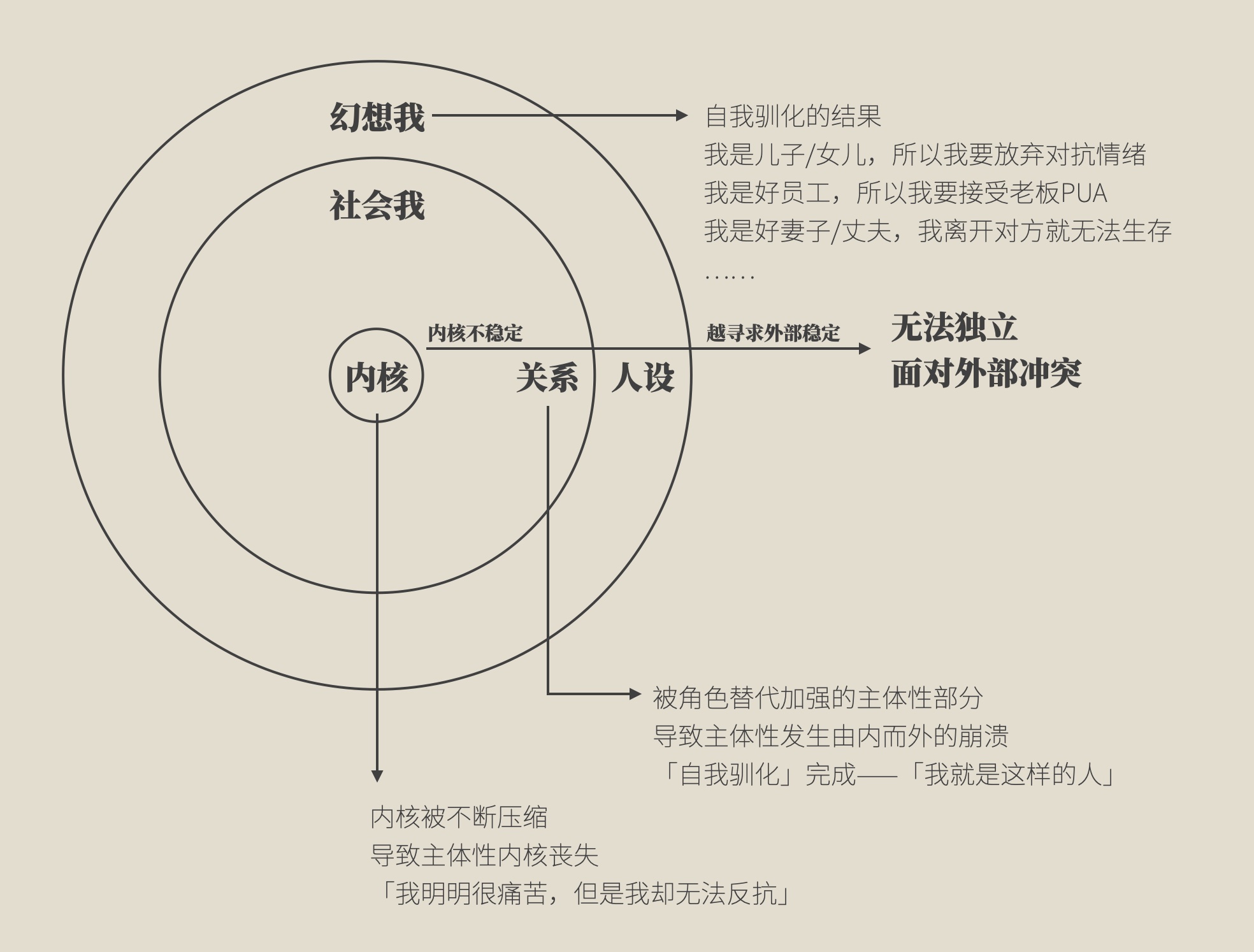 角色替代首先破坏的,显然是主体性的「内核部分」。当被角色替代时,就意味着他将会有大量的「社会我」给他设置了各种枷锁,比如「妈妈都是为了你好」,无论母亲如何地做,孩子都必须要听从父母的安排。当「社会我」的模块被角色替代填满时,就必然会去压缩内核的空间,以至于当事人不再清楚自己真正想要的是什么。一旦完成自我驯化,就会出现更多的「幻想我」来填充主体性的缺失,即「我就是母亲的好孩子」。