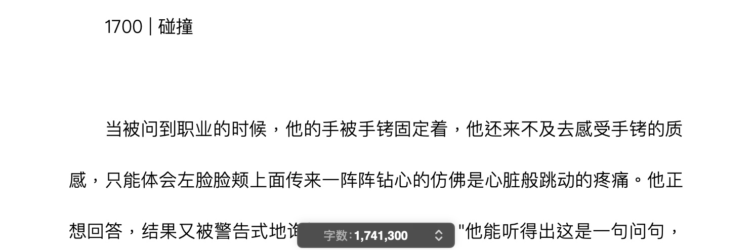 我给了他一张截图,证明当初的《∞》坚持到了第 1700 篇文章(每天 3 篇,即 566 天左右),总计 1,741,300 个字。参与感的部分,就是让对方选择 1 到 1700 里的任意三个数字,我将这三个序号的文章内容展示出来。同时,如果该数字前后的内容是属于「系列」的,即当天的文字内容在聊一个话题,或是在完成同一部小说,他可以选择是否要看「关联性」的证据。