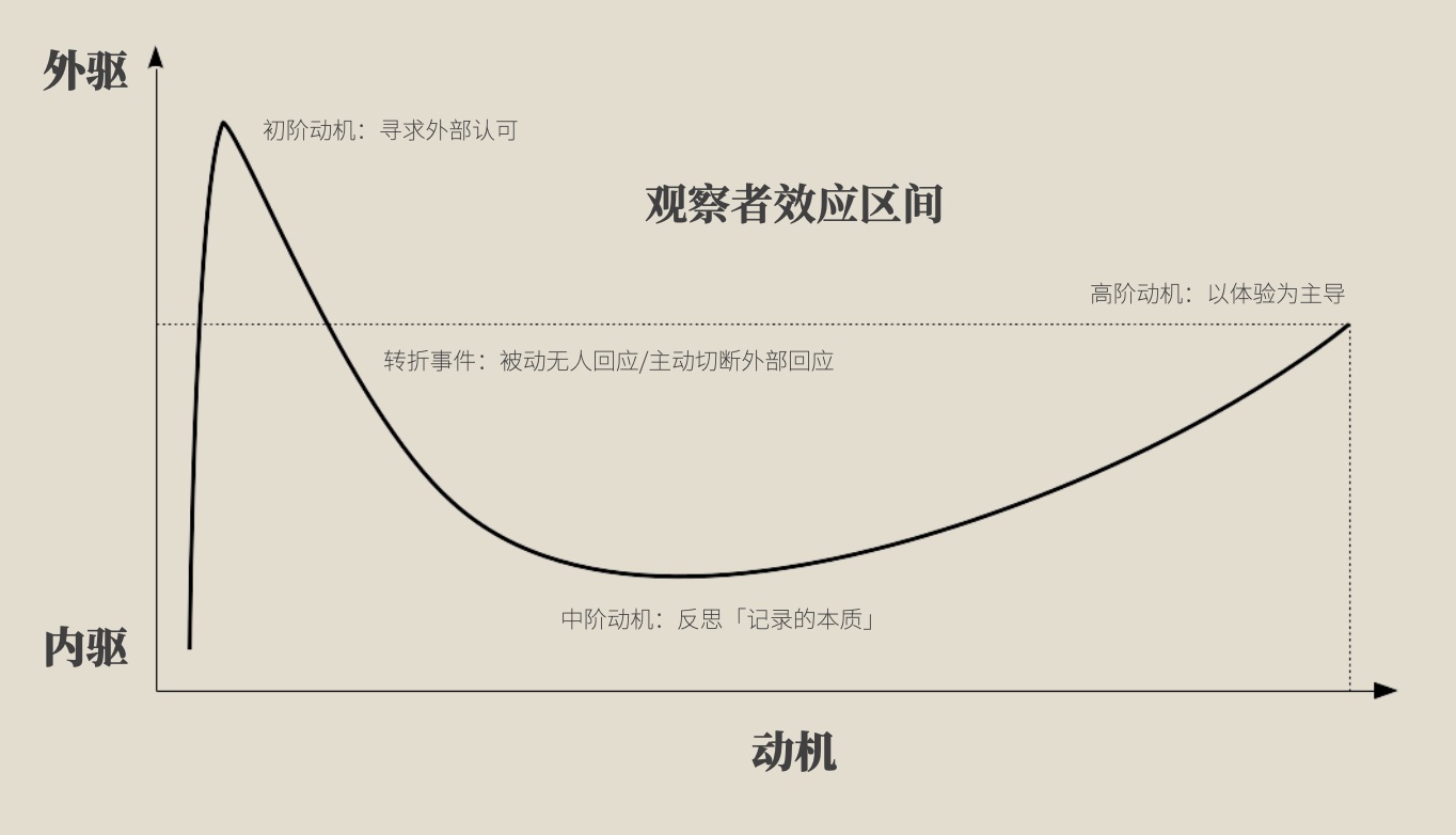 • 内驱的动机,当外部驱动不存在时,人们会重新思考「记录的本质」,特别是当外部认可变少或不存在时,人们对于「回应」的渴望还是对内,形成强烈的对内回应模式;