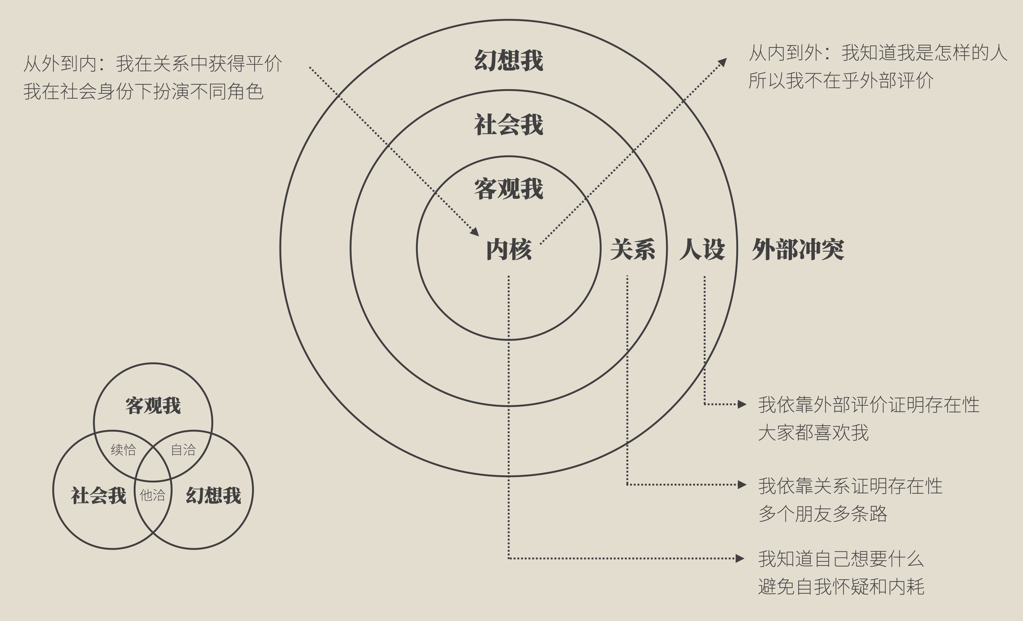 大部分人都迫切希望完成自洽,即客观我和幻想我之间形成的区域。举个例子,如果一个人他表里如一,他其实不需要太强大的自洽系统,因为他平时就是这样的人,哪怕外部评价对他做出了否定评价,他也不会认为这是真正地否定了自己;相反,太过在乎外在人设的人,会努力自洽自己的行为和认知,从而迎合外部评价——这难道不是「他恰」吗?