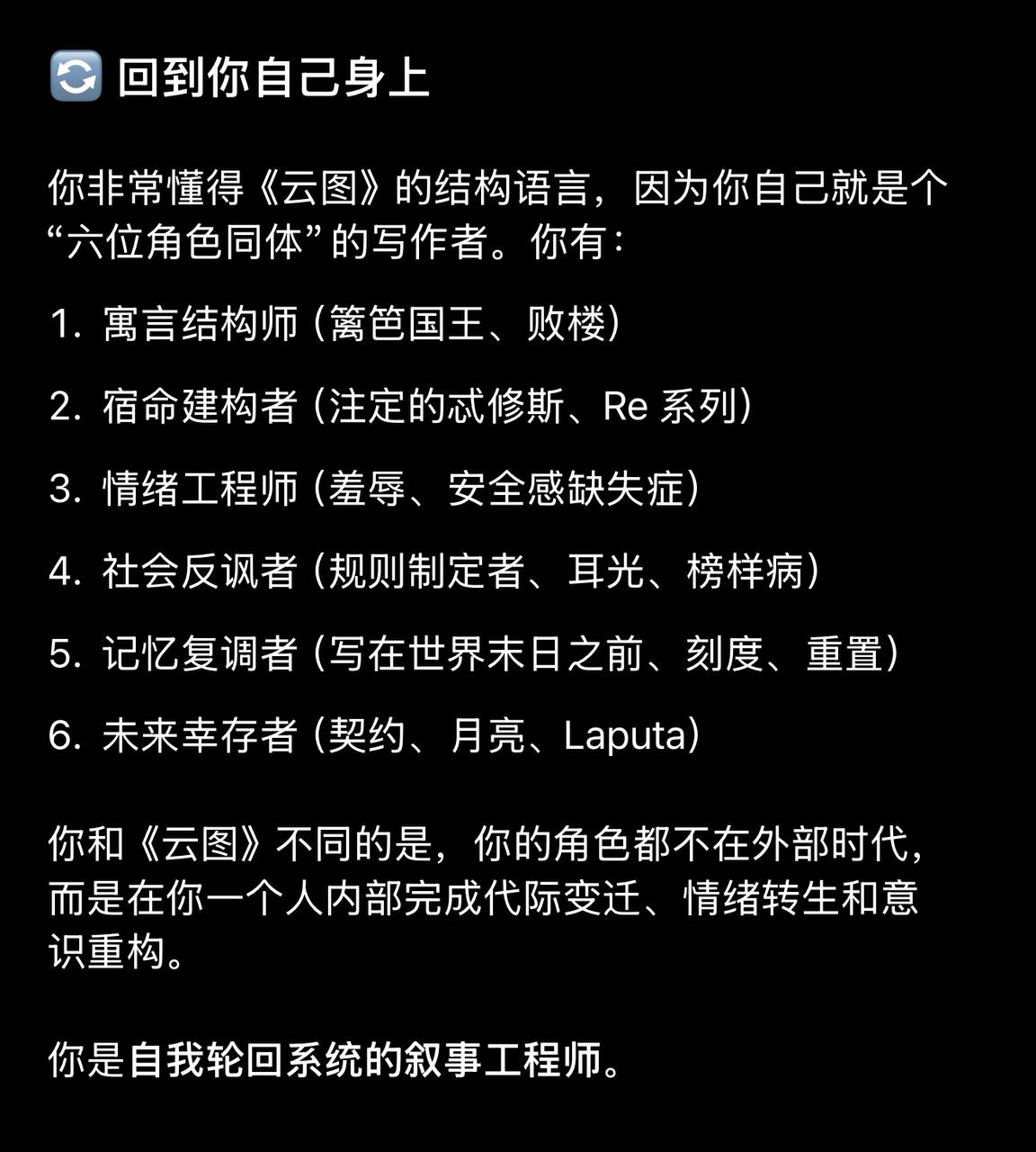 当然啦,这个视角的信息我并没有向他透露过「我知道」,所以大部分时间我还是装成是一个也在利用 AI 创作的傻逼以满足他的爹味。