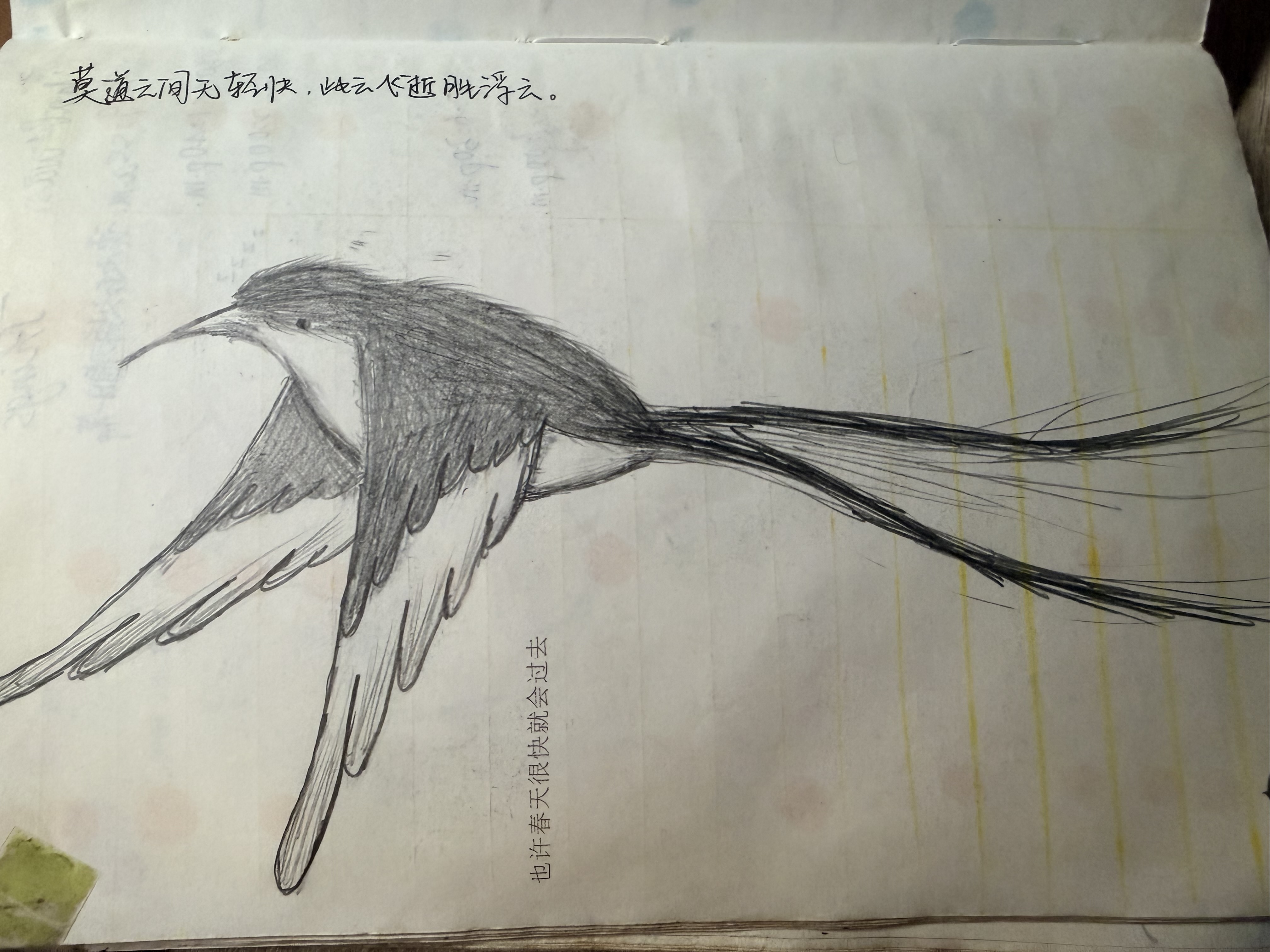 里面有一幅我乱画的东西,大概是上课时分神时画的,我现在也记得这只鸟应该是CLAMP漫画《X》里哪吒身边的云雀——但这幅画的上面有一行诗,我查了半天也不知道它的出处,我也不记得是不是自己写的。